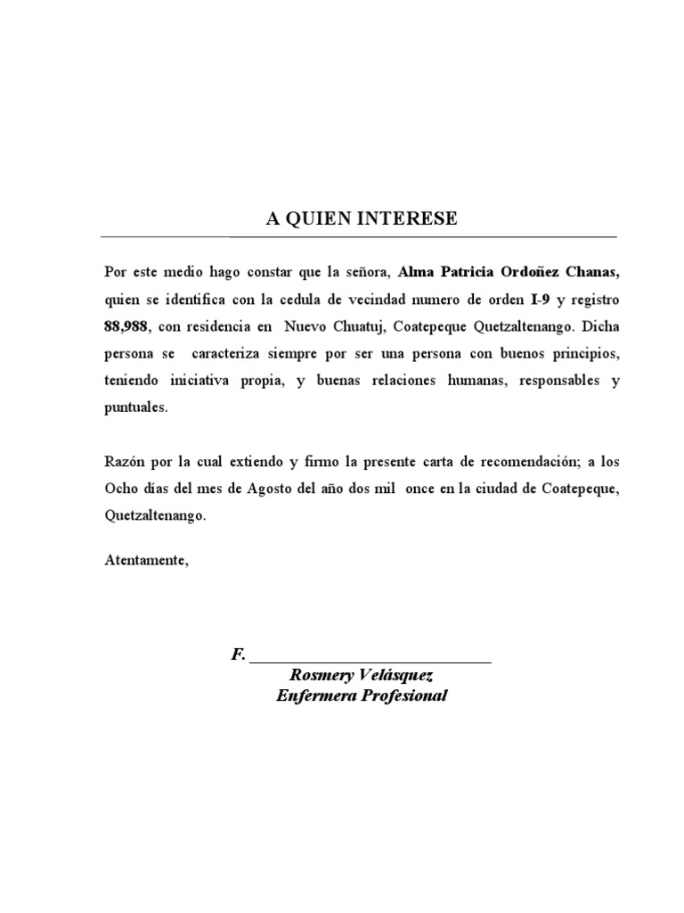 Ya sean estos de carcter acadmico de aspectos laborales o para algn otro fin personal. Una carta de recomendacin es un documento que adems de acreditar la experiencia. El nombre de quien recomienda y del postulante.
