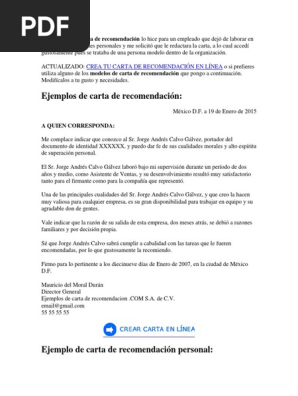 Carta con recomendacin laboral certificado situacin. Lo que los expertos no estn comentando sobre Ejemplo De Carta De Recomendacion Laboral Pdf y cmo le afecta. Davalos caldern francisco Javier el cual laboro con migo_____ de la fecha _____a _____ El cual durante el tiempo que laboro conmigo demostr ser una persona respetuosa honesta responsable y atenta en las labores encomendadas.