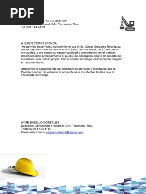 Carta de recomendacion para empresa constructora. Cesar Gonzales Rodrguez labora bajo mis rdenes desde el ao 2010 con un sueldo de 25 mil pesos mensuales y me consta su responsabilidad y competencia en el trabajo desempeando principalmente el puesto de encargado en. 4567878 Lima 28 de Marzo de 2011 Pedro Fort Ros Gerente General Cementos YUCRA SA. Debe notar que como en toda carta se debe iniciar con un saludo cordial.